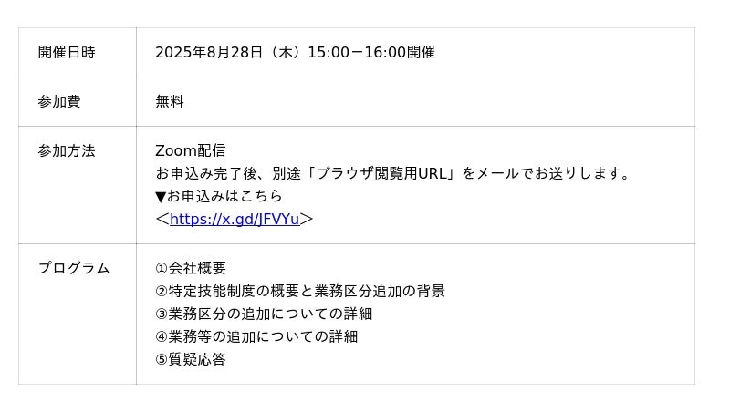 ウィルグループの総合人材サービスを手掛ける株式会社ウィルオブ・ワーク(本社:東京都新宿区、代表取締役社長:村上 秀夫)は、無料オンラインセミナー『特定技能受け入れ業種がまる分かり!特定技能 工業製品製造分野における追加業務区分の徹底解説セミナー』を、2025年8月28日(木)に開催します。