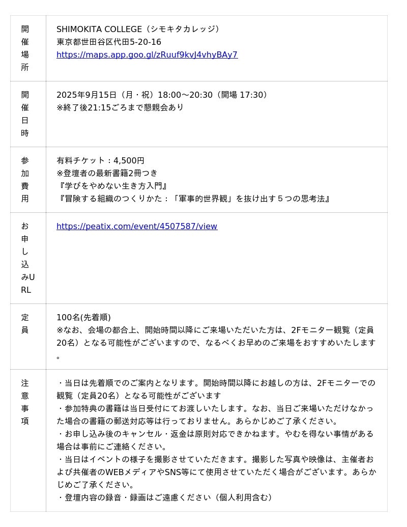 株式会社MIMIGURI(本社:東京都文京区、代表取締役Co-CEO:安斎勇樹・ミナベトモミ)は、立教大学経営学部教授の中原淳氏の新刊『学びをやめない生き方入門』(テオリア/フォレスト出版)と、弊社代表取締役Co-CEO 安斎勇樹の著書『冒険する組織のつくりかた』の刊行を記念し、2025年9月15日(月・祝)にSHIMOKITA COLLEGE(シモキタカレッジ)にてトークイベント「学びをやめない“冒険的”キャリア論」を開催いたします。