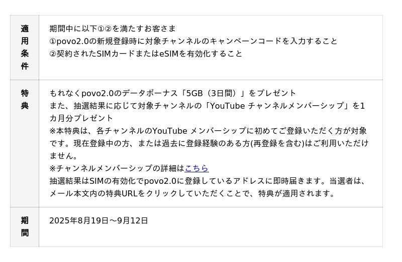 KDDI、沖縄セルラーは2025年8月19日から9月12日まで、povo2.0に新規加入いただくと、もれなく「5GB(3日間)」に加え、抽選で「YouTube チャンネルメンバーシップ」1カ月無料コードが90%の確率で当たるキャンペーンを実施します。