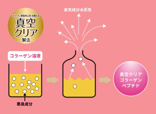 コラーゲンペプチド溶液を高温の水蒸気で瞬時に加熱し、その後瞬間的に減圧することで、水蒸気とともに臭気成分を除去する方法です。