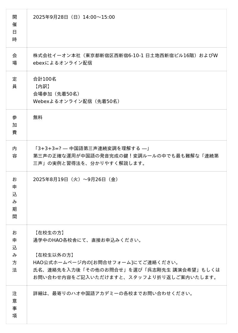 株式会社イーオン(本社:東京都新宿区、代表取締役社長:重野卓、以下「イーオン」)は、イーオンが運営するハオ中国語アカデミーの開校20周年を記念した特別企画8弾として、2025年9月にNHKラジオ『レベルアップ中国語』講師の呉志剛(ご しごう)先生をお招きして、中国語発音の最難関といわれる「第三声の連続変調」について、特別講演会を開催いたします。「第三声の変調」は、多くの中国語学習者にとって悩ましい発音ルールの一つです。今回は、「第三声が3回連続したケース」を詳しく解説していただきます。