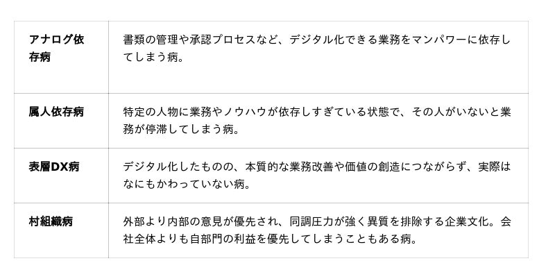 会社の問題は、慢性疾患の進行によく似ています。初めは気づかないほどの小さな予兆だったものが、放置するにつれ徐々に進行し、気づいたときには生産性やモチベーションの低下、離職の増加といった大きなリスクをはらむこととなります。さらには合併症のように複数の課題が絡まりあうことで、より複雑で解決が難しい状態になってしまう点も類似しています。