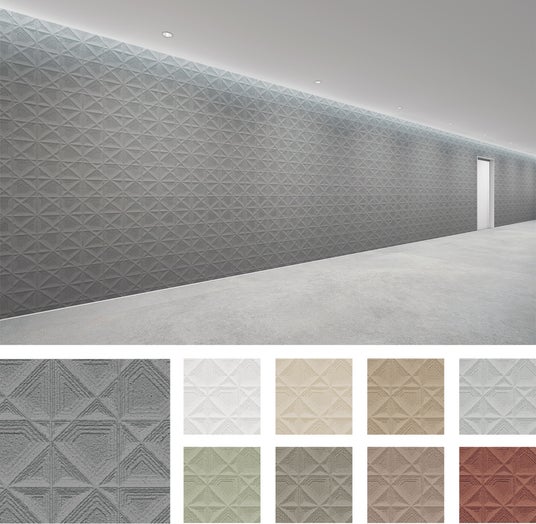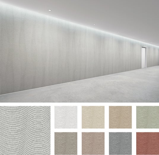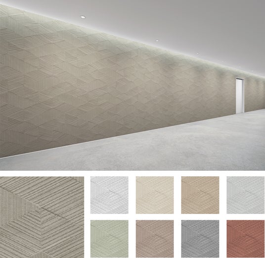 大胆なパターン構成により、エレベーター廊下や共用部のような広い空間でもインパクトのある壁面へ。ザラっとした質感も細かく表現しています。また、どのような空間にも馴染むような落ち着いたトーンとカラーバリエーションで構成。お好きな色に変更も可能なので、空間のコンセプトやコーポレートカラーに合わせた調整により、イメージしたい表現に近づけることが可能です。