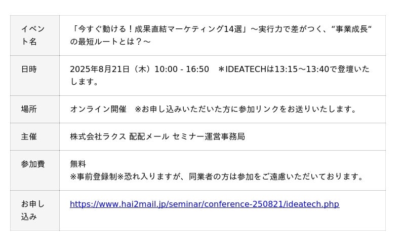2025年 8月21日(木)に開催されるセミナーイベント「今すぐ動ける!成果直結マーケティング14選」~ 実行力で差がつく、“事業成長“の最短ルートとは? ~」に、株式会社IDEATECH 取締役の競仁志が登壇します。本セミナーでは、市場の声・顧客の声を武器に受注を生み出す「リサーチデータマーケティング」について解説いたします。