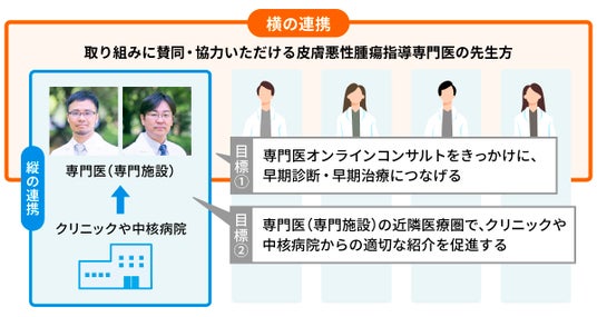 「皮膚がんエキスパートライン」は地域の医療機関と専門医の“縦の連携” と、皮膚がんの専門医同士の“横の連携”を強化することで、早期発見・早期治療・疾患啓発を目指す取組です。