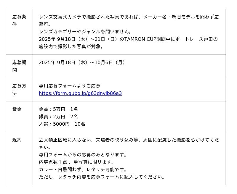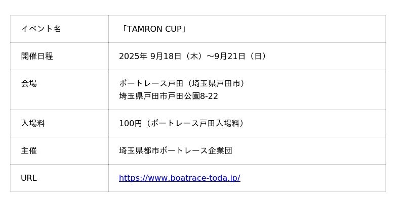 株式会社タムロン(本社:埼玉県さいたま市)は、2025年9月18日(木)~9月21日(日)に埼玉県戸田市ボートレース戸田で開催されます「TAMRON CUP」に協賛いたします。あわせて、開催期間中にボートレース戸田の敷地内で撮影された写真を対象としたフォトコンテストも実施。流し撮りをテーマに、迫力ある一瞬をとらえた作品のご応募をお待ちしております。