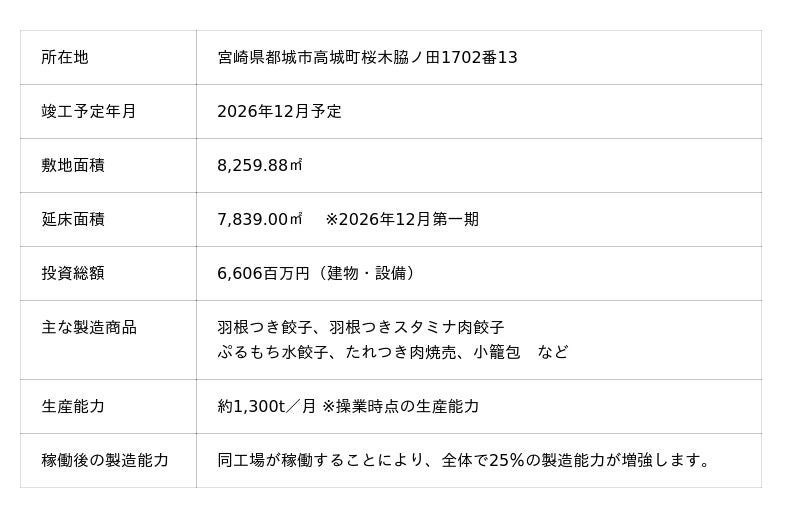当社は昨年、冷凍餃子売上第一位という悲願を達成いたしました。新工場では将来的に年間生産量約2万トンを想定しております。このたびの都城市との素敵なご縁を活かし、今後も大きく躍進できるよう、地元都城市民のみなさまをはじめとする地域の方々に信頼され、愛される工場をめざしていきたいと思っております」