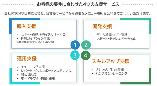 本サービスは分析ツールを活用したレポート・ダッシュボード作成からメンテナンス、スキルアップまでをカバーしており、お客様の状況や目的に合わせ、サービスメニューの中から必要な支援サービスを柔軟に組み合わせて利用できます。BIソリューションとしては、Power BI、Qlik Sense、Tableauに対応しており、今後、ニーズに応じて拡充・変更していく予定です。