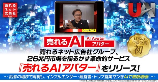 【日本の上場企業初※】売れるネット広告社グループ、26兆円市場を揺るがす革命的サービス『売れるAIアバター』をリリース!話者の魂まで再現し、インフルエンサー・経営者・トップ営業マンをAIで無限増殖!