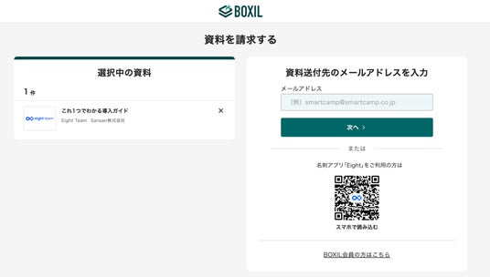「Eight」ユーザーは、資料請求時に「BOXIL」の画面に表示されるQRコードをスマートフォンで読み取るだけで、簡単にログインできます。さらに、会員登録時には、登録フォームに手動で情報を入力する必要がなく、「Eight」に登録された名刺情報が自動で連携されるため、入力の手間を軽減できます。