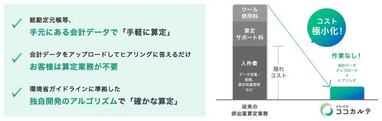 Kabbara合同会社のCO2製品1次データ算定サービスは、Kabbara独自の算定フレームワークとSCSK株式会社の開発するCO2排出量算定サービス「CO×COカルテ(ココカルテ)」を活用し、中小企業の経営者様や脱炭素ご担当者様向けに、以下のようなサービスを提供します。1.手間なく、確かな算定を実現