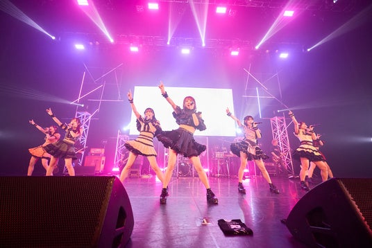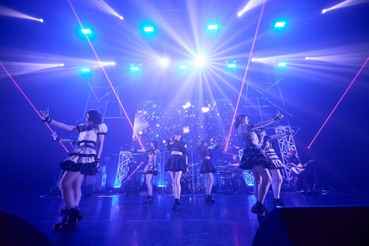 その後、続けざまに披露された「絶対絶命LOVE」。ギターとドラムの激しいリズムに乗って、観客を煽りながら、「豊洲PIT、まだまだ足りないんじゃない!?」と叫ぶ。観客はその掛け声に応え、腕をあげる。CO2が爆発的に吹き上がり、視覚的にも圧倒される中、メンバーはますます勢いを増し、激しいダンスで会場の温度をさらに上げていく。