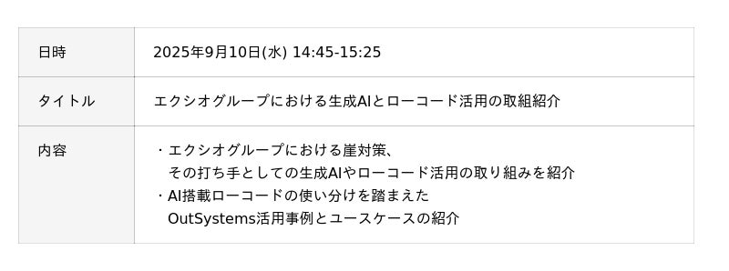 エクシオ・デジタルソリューションズ株式会社(本社:東京都港区、代表取締役社長:前田幸一、以下「当社」)は、2025年9月10日(水)に開催されるOutSystems社主催のカンファレンス「One World Tour Tokyo 2025」にブース出展・セッション登壇することをお知らせいたします。