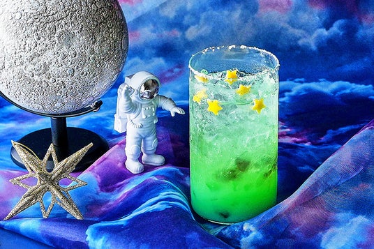 (右)遥か彼方からやってくる「宇宙の旅人」とも称される彗星。肉眼で観測できた時の色合いをイメージし、メロンリキュールの鮮やかなグリーンを活かし、ブルーキュラソーシロップを合わせ流れゆく色合いを再現。中間層にバイオレットジュレを仕込むことで、ステアすると彗星の尾を引くさまをグラスの中で表わした一品。