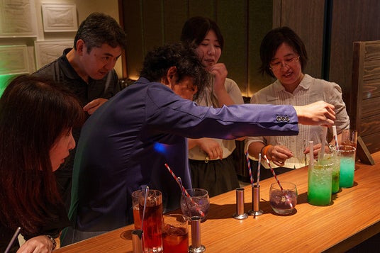 どんな天体や現象をカクテルとして表現するかというところを具体化するべく、コスモプラネタリウム渋谷へのヒアリングからスタート。星空解説員の方々は「この時期に起こる特別な現象にちなんだカクテルや自分たちでも見てみたい天体のカクテル、そして『コスモプラネタリウム渋谷』の名を冠するカクテルを作ってもらえたら」という想いで5つのテーマを選んだとのこと。そんな想いをカタチにすべく、プラネタリウムで番組を鑑賞しイメージを膨らませたほか、細部まで調べることで、商品1つ1つに向き合い、イメージに近づける工夫をしました。天体の色味や現象の色は、複雑に絡み合う色味が多く、また、味わいも気にしながら何度も試作を重ね微調整を行いました。コスモプラネタリウム渋谷の方々に味見や、見た目など細部に渡り確認していただき、最終調整をし、最後の1滴まで楽しめるカクテルが完成しました。