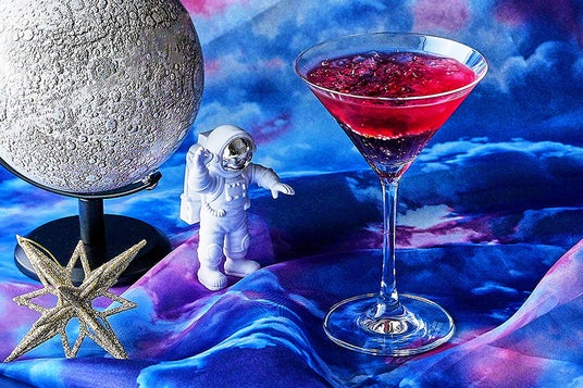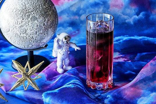 (中央)次回の皆既月食は2025年9月8日未明から明け方。このイベント期間に奇跡的に見ることのできる神秘的な現象をロングカクテルに。月と地球の重なりが大きくなることで、徐々に赤褐色に移り行く色合いをウォッカとクランベリージュースの層にすることで、アンニュイな色合いを出し、宇宙の神秘をブラックウォッカで儚くも過ぎ行く貴重な時間をクランベリージュースの甘酸っぱさで表現。