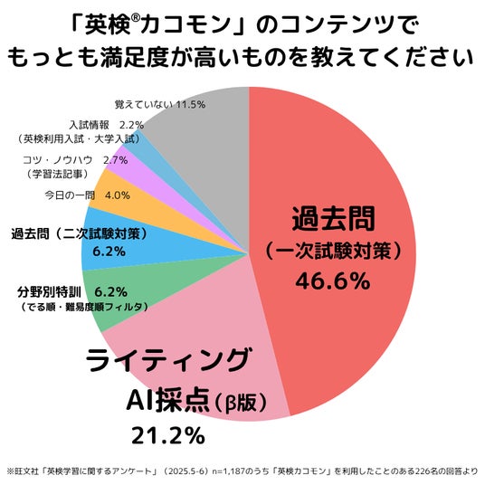 旺文社が実施した「英検学習に関するアンケート」(2025年5月30日~6月30日)の中で、「英検カコモン」を利用して英検対策を行ったユーザーを対象に、満足度を調査いたしました。その結果、もっとも満足度の高かったコンテンツは「過去問(一次試験対策)」46.6%、「ライティングAI採点(β版)」21.2%、次いで「分野別特訓(でる順、難易度順フィルタ)」、「過去問(二次試験対策)」となりました。