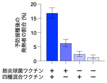 肺炎球菌ワクチンと四種混合ワクチンを含むかどうかで、ワクチン接種後の発熱者の割合を算出。他のワクチンを同時に接種している場合も含む。肺炎球菌と四種混合ワクチンの同時接種は最も発熱する頻度が高い。