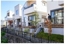 湧水と清流を市のシンボルとする東京都東久留米市の落合川沿いに開発された分譲住宅です。従来の経済性重視の開発では、川沿いぎりぎりに擁壁を設け、そのすぐ上に家々の壁がそびえることで、川には影が落ち、川からの景観にも圧迫感をもたらします。 当分譲地では、擁壁を設けず、川と住戸の間に傾斜を伴った緑のバッファゾーンを設けたことで、川には日が差し、自然生態系に優しい環境になりました。対岸からの風景も水辺と住まいが一体となって感じられるものになり、水遊びをする子ども達の姿までを含めて、湧水と清流の街らしい景観を生み出すことができ、子ども達の豊かな感性の形成に役立つ環境となりました。