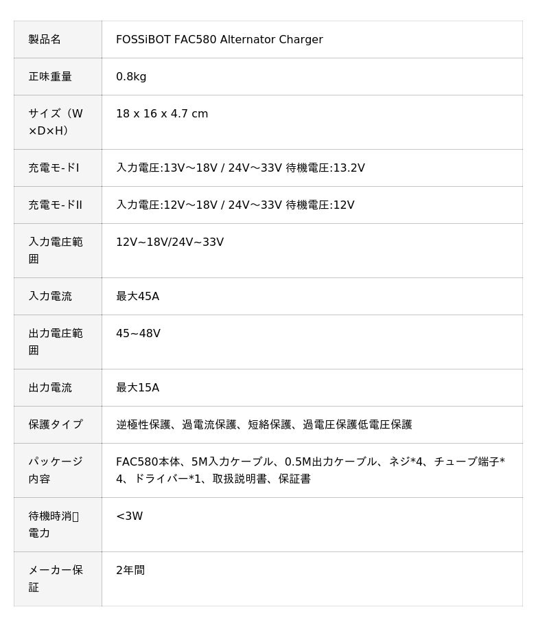 FOSSiBOT FAC580 Alternator Charger 走行充電器 製品仕様