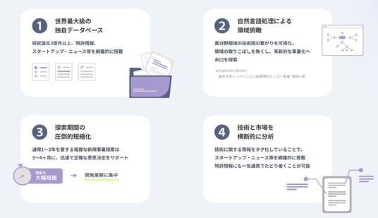 MEMORY LABは、特許取得済みの自然言語処理AIを搭載した調査エンジンを用いて、数十億件規模の学術・特許・市場データを短期間で解析し、新規事業や研究開発の方向性を明確化する技術を有しています。