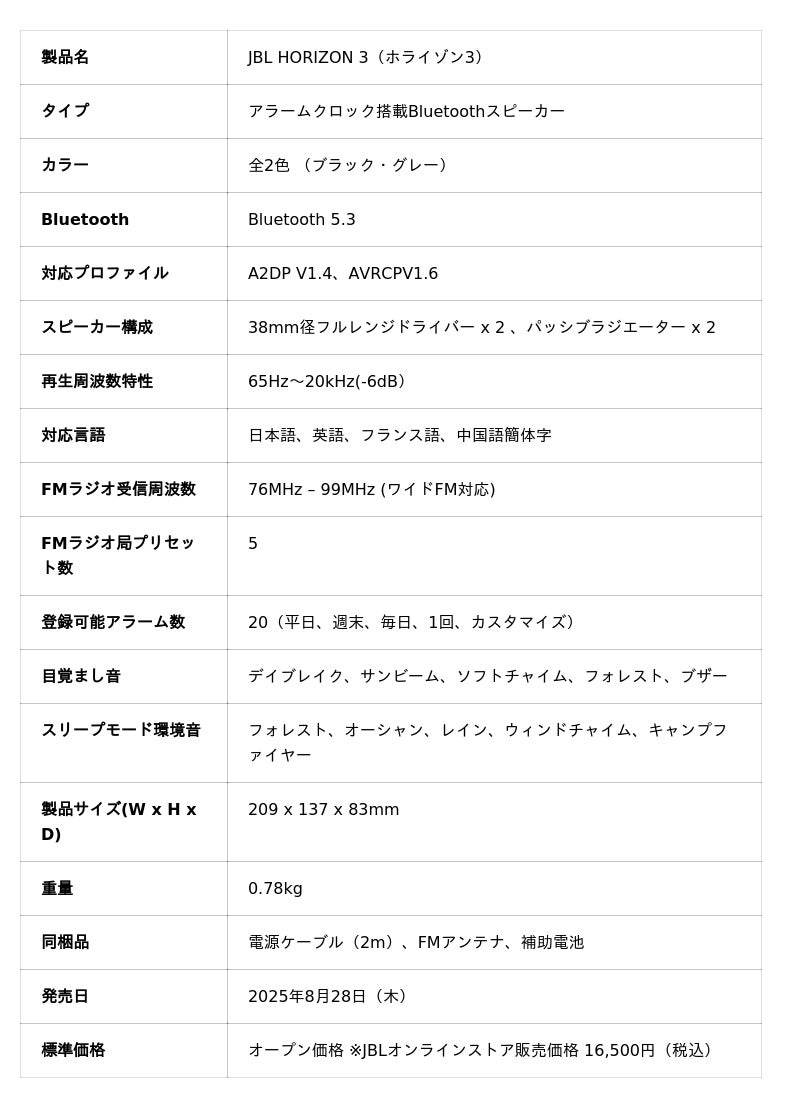 ハーマンインターナショナル株式会社(本社:東京都千代田区、代表取締役:桑原拓磨)は、アメリカ カリフォルニア発祥の世界最大級のオーディオブランドであり、日本においてワイヤレススピーカー7年連続販売台数No.1※1に輝く「JBL」より、サウンドと光で快適な睡眠と心地よい目覚めをもたらすアラームクロック搭載Bluetoothスピーカー「JBL Horizon 3(ホライゾン3)」を2025年8月28日(木)より発売いたします。