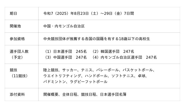 スポーツを「する」「みる」「ささえる」ための環境づくりを行うJSPO(正式名称:公益財団法人日本スポーツ協会 東京都新宿区/会長 遠藤利明)は、本年8月23日から中国・内モンゴル自治区で開催される、日本・韓国・中国の高校生トップアスリートが集う標記競技会へ、日本選手団245名を派遣します。