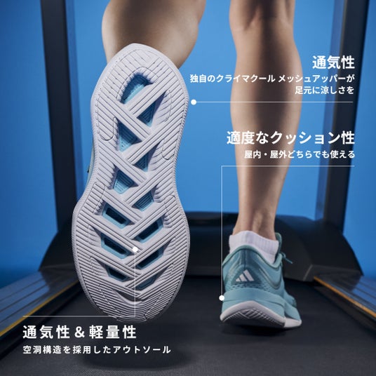 「TREADSPEED(TM)」は、汗や熱を効率よく逃がし、足部内のシューズ温度の上昇を防ぐadidas独自のClimacool(R)(クライマクール)テクノロジーを搭載したメッシュアッパーを採用。高い通気性をサポート。さらに、ミッドソールとアウトソールが一体化した軽量構造に加え、クッション性と安定感を兼ね備えた2層構造のミッドソールが足元への負担を軽減。
