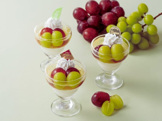 宝石のような輝きを閉じ込めて。シャインマスカットとぶどうのジュレが彩る、秋空のように爽やかなパンナコッタ。ぜひご賞味ください。