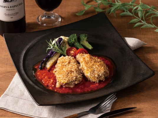 サクッとした心地よい食感、そして香草の豊かな香りのパン粉でチキンの旨みを閉じ込めた、心も満たされる一品です。