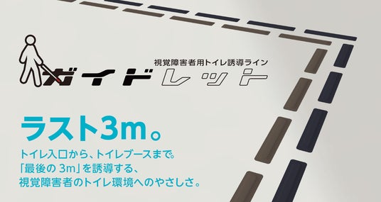 視覚障害者トイレ誘導ライン「ガイドレット」は、広く設計されているバリアフリートイレ内での「迷い」を解消するために生まれたガイド。入口とトイレブース、洗面台などを結んで動線を誘導します。