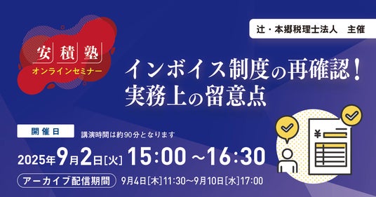辻・本郷 税理士法人(本社:東京都新宿区、理事長:桑木小恵子)は、2025年9月2日(火)にオンラインセミナー「【安積塾】インボイス制度の再確認! 実務上の留意点」を開催いたします。令和5年10月に導入された適格請求書等保存方式(インボイス制度)は、施行からまもなく2年を迎えます。消費税に関する取扱いは依然として事故事例が多く、今後はインボイス制度に関連した新たなトラブルが発生する可能性も想定されます。