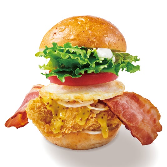 今年新登場の月見バーガー。チキンフィンガーに、とろーり黄身ソースの目玉焼き風オムレツを重ね、ベーコン・レタス・トマトを合わせた定番のBLTスタイル。ソースのハニーマスタードとの相性は抜群で、フレッシュ野菜にベーコンの塩味と旨味、黄身ソースのまろやかさが重なり合う絶妙なバランスが、美味しさの決め手です。