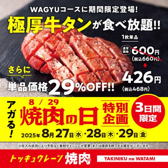 ワタミ株式会社(本社:東京都大田区、以下ワタミ)が全国で展開する、高品質な焼肉をリーズナブルな価格で提供する「焼肉の和民」では、8月29日の「焼肉の日」に合わせ、2025年8月27日(水)から29日(金)の3日間限定で特別企画を開催いたします。
