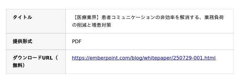 マーケティングプラットフォームを提供するエンバーポイント株式会社(本社:東京都千代田区、代表取締役:五十嵐 真人)は、医療業界のDXをテーマにした最新ホワイトペーパー「【医療業界】患者コミュニケーションの非効率を解消する、業務負荷の削減と増患対策」を公開しました。