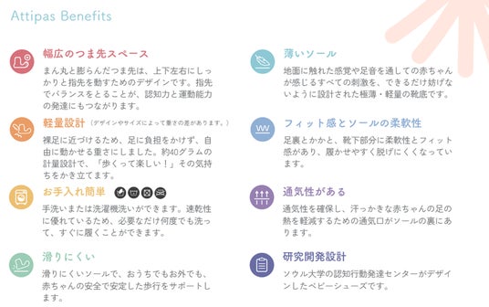 Attipas(アティパス)は、成長によって変化する赤ちゃんの足に着目し、産学共同で7年にも及ぶ研究の結果に基づいて作られた歩育シューズです。歩き始めの赤ちゃんにとって大切な「裸足の感覚」に近づけて作られており、靴選びに大切なポイントが詰まっています。2011年にスタートし、今ではオーストラリア、スペイン、アメリカなど世界30ヵ国以上のママやパパに愛される安心、安全のブランドです。