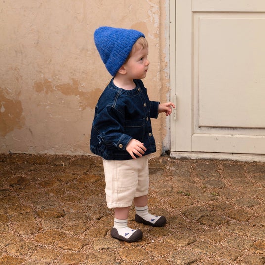 くすみブラウンに履き口のラインが映える、優しい色合いの一足。フロントのニット帽モチーフは、見るたび心和むアクセントに。お揃いの帽子やベージュ系コーデと相性抜群で、秋冬のお出かけにもぴったりです。