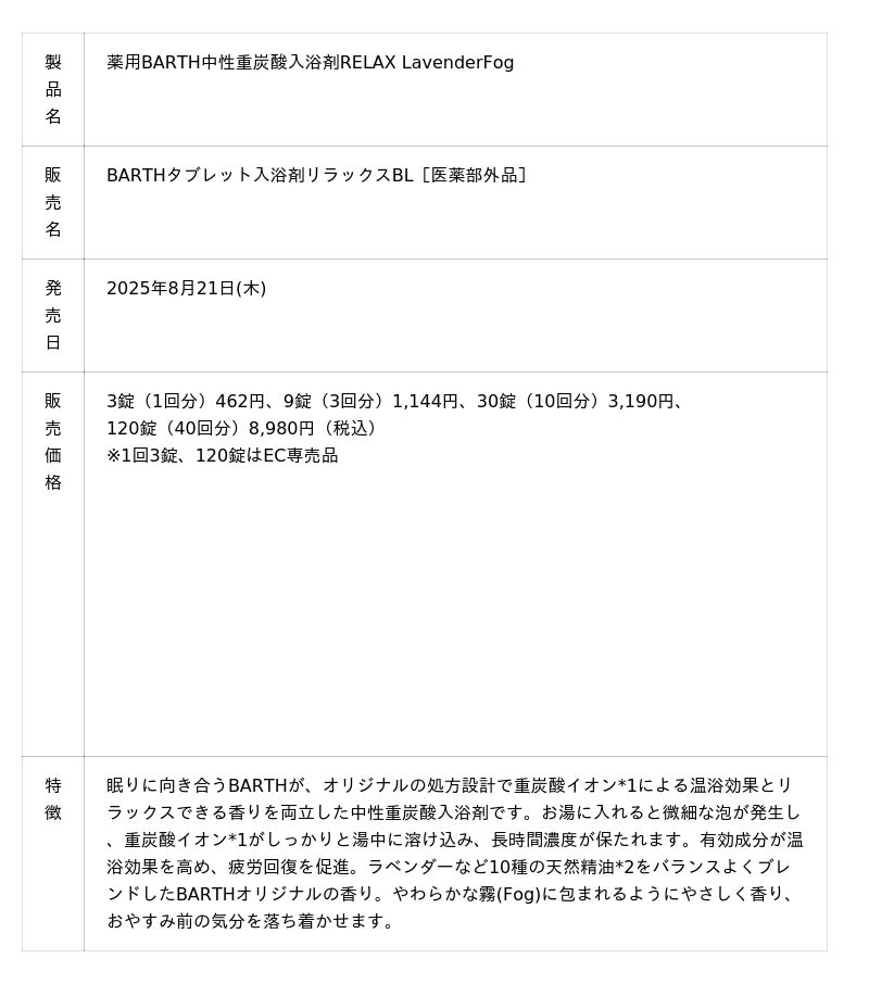 バスタイムからスリープタイムまでワンランク上のナイトルーティンを提案するナイトウェルネスブランド「BARTH(バース)」は、おやすみ準備にぴったりなやさしいラベンダーの香りの入浴剤『薬用BARTH中性重炭酸入浴剤RELAX LavenderFog』を2025年8月21日(木)に発売しました。