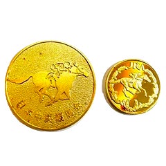 24金(K24) JRAメダル 2枚日本中央競馬会(JRA)にて発行された大小異なるデザインの純金メダルです。一体、いつどこで入手出来たのか詳細は不明ですが、コレクターや競馬ファンを惹きつけること間違いなしです。
