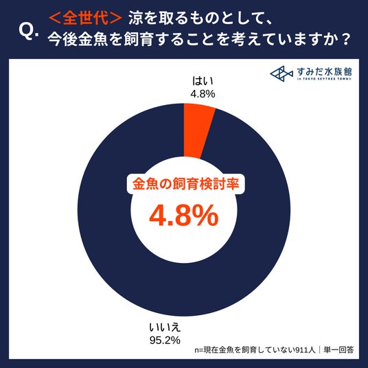 現在金魚を飼っていない人に対して、「『涼』をとる存在として今後金魚の飼育を考えているか」を質問。「考えている」と回答したのは、全体では4.8%でしたが、40代の女性に絞ってみると、約10人に1人(9.9%)が金魚の飼育を検討していることがわかりました。一部の人にとっては、金魚は“涼”を感じる稀有な存在として一定の支持を集めていると言えます。