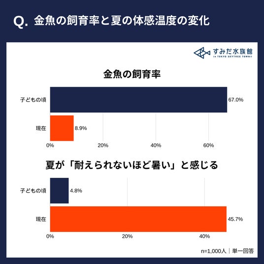 金魚の飼育率は、子どもの頃が67.0%だったのに対し、現在はわずか8.9%と大きく減少。一方で、子どもの頃に「夏が耐えられないほど暑い」と感じていた人は4.8%だったのに対し、現在は45.7%と約半数が夏がより暑くなっていると感じていることがわかりました。