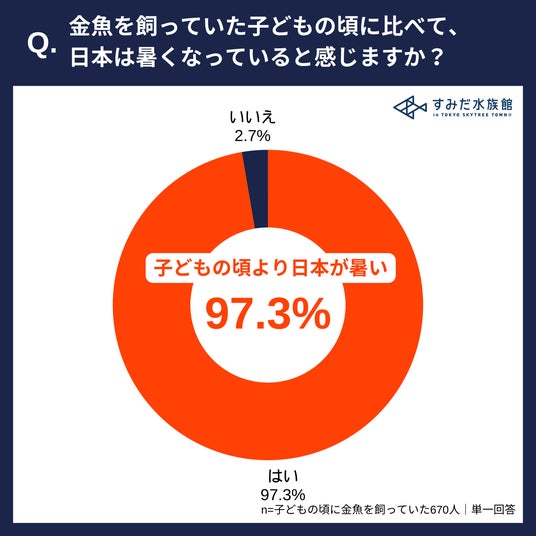 子どもの頃に金魚を飼っていた人は全体の67%と、約3人に2人にのぼります。その金魚飼育経験者に対して「子どもの頃と比べて日本は暑くなっていると感じるか」を尋ねたところ、97.3%が「はい」と回答。かつて金魚を飼っていた人たちのほとんどが、当時よりも今の夏のほうが「暑い」と実感していることがわかりました。