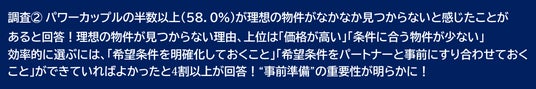 また、Q4の「理想の物件がなかなか見つからないと回答した方に伺います。理想の物件がなかなか見つからない理由は何だと思いますか?」に対して、パワーカップルは「条件に合う物件が少ない」(57.4%)が2位であったことから、パワーカップルは希望の条件を強く持って、住宅選びをしていることがわかります。
