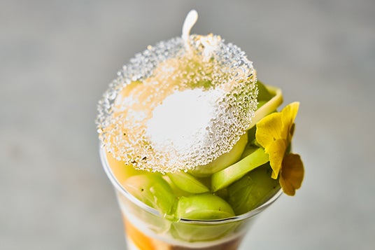 トップにはすっきりとした味わいのフローズンヨーグルトに飴細工とチョコレート、エディブルフラワーを添え、落ち着いた中にも洗練された華やかさのあるデザインにしました。下層部にはシャンティクリームやアプリコットソースを使用し、グラスの中で様々な味わいを楽しめる、飽きのこないパフェに仕上げました。