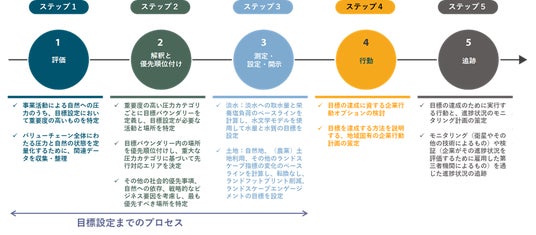 ネイチャーSBTsは、1.評価、2.解釈と優先順位づけ、3.測定・設定・開示、4.行動、5.追跡という5つのステップで構成されています。これにより企業は、適切な場所で、適切な時間軸で、適切な行動をとることが可能となり、2030年までに自然損失をくい止め、反転させるために自らの役割を果たすことが可能になります。