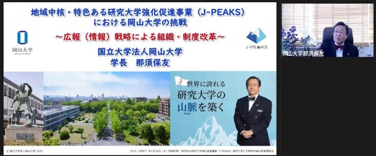 那須学長は、「地域中核・特色ある研究大学強化促進事業(J-PEAKS)における岡山大学の挑戦~広報(情報)戦略による組織・制度改革~」と題して発表。本学では学内広報(情報)を用いて、ありたい未来の姿に向けた「行動変容」と「意識改革」を促していることについて紹介しました。また、教職員一人ひとりが広報を行い、どのような小さなことも記事化しホームページに蓄積すること、ホームページを情報のデータベースとして活用し、資料作成時の労力削減等の効率化にもつながっている点などについても紹介しました。