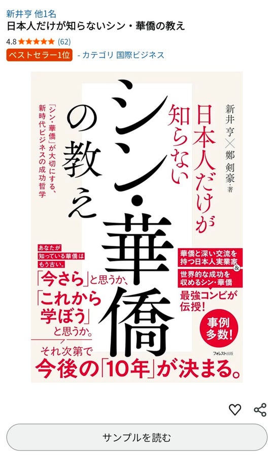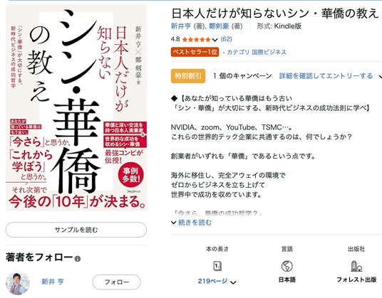 新井亨・鄭剣豪による書籍「日本人だけが知らないシン華僑の教え」Amazonにてベストセラー1位を獲得