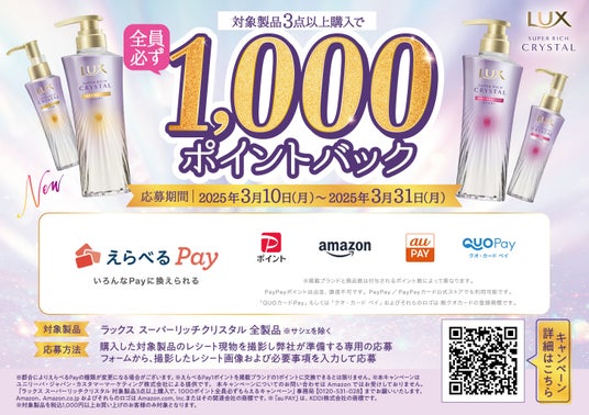 店頭発売が開始する3月10日(月)からは、3点以上「ラックス スーパーリッチクリスタル シリーズ」を購入すると、応募者全員に「えらべるpay」1,000円分がポイントバックされるキャンペーンを開催します。