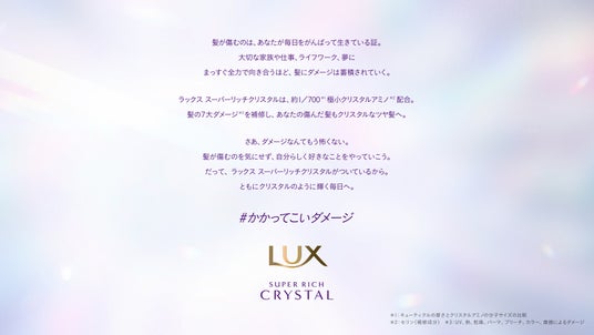 7つのダメージに着目した「ラックス スーパーリッチクリスタル シリーズ」。「ダメージ」をネガティブなものと捉えず、なりたい自分になることや何かに打ち込んでいた証として肯定しながら、「ラックス スーパーリッチクリスタル シリーズ」は、クリスタルなツヤ髪へと導きます。
