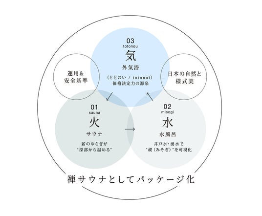 地方観光は長らく温泉資源への依存が大きく、温泉がない地域は集客上の不利を抱えてきました。当社は“火・水・気”と禅の精神性を核に、「薪火サウナ→天然水の冷水浴→外気浴」という三位一体の作法で深い内省と覚醒をもたらす“禅サウナリトリート”を開発。